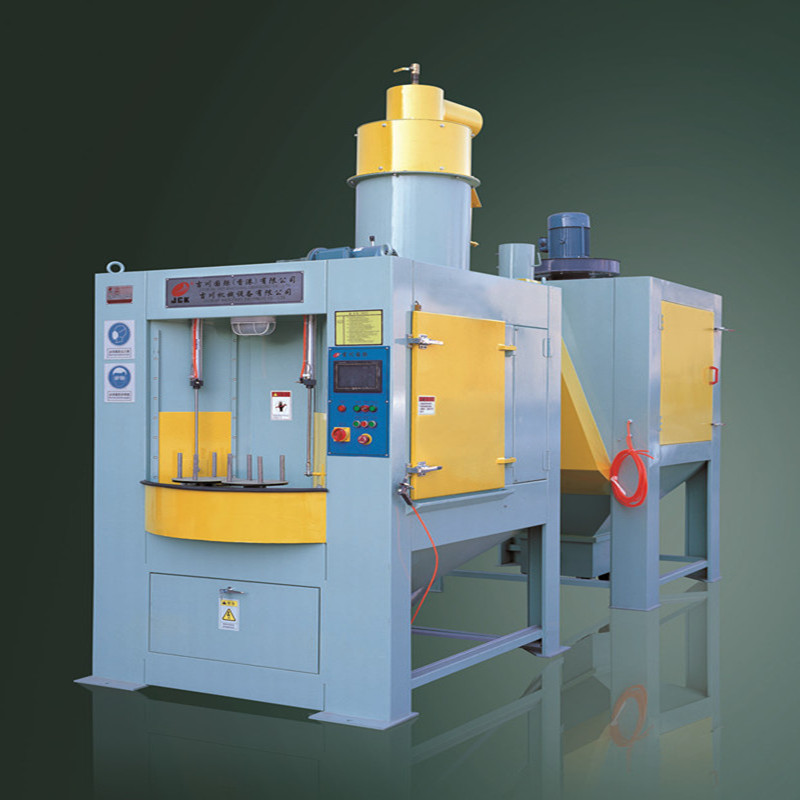 转盘式自动喷砂机又叫转台式自动喷砂机、间隙式自动喷砂机、连续式自动喷砂机。他也是一款高产能、高效率的自动喷砂机。喷砂大转盘上上配置8个小转盘,又分为4个区域,喷砂装卸区、喷砂待加工区、喷砂加工区、吹净室。 需要喷砂机的产品人工放在喷砂装卸区。大转盘会自动旋转,整个旋转在360°人工只需要站在同一位置将产品装、卸即可。 用户也可根据自己的一些产量要求配置流水作业,但是配置装、卸区一般需要机械手,成本较高。 转盘式自动喷砂机适用于盘类、圆柱类、方形工件的内外表面喷砂批量生产,如工艺品、玻璃灯罩、不粘锅、手电筒、烤盘、不锈钢洗手盆、通讯器材等工件。